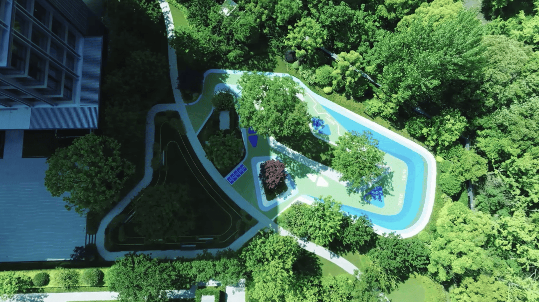 树木成为了空间的天然边界,最大限度地将小区外的景和社区空间融为一体,让内外双公园衔接得非常自然。