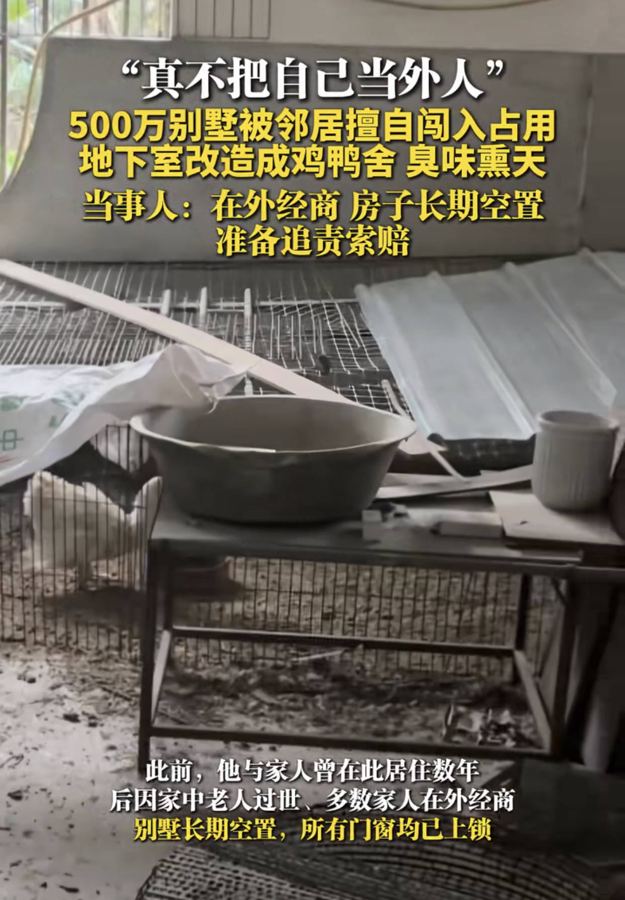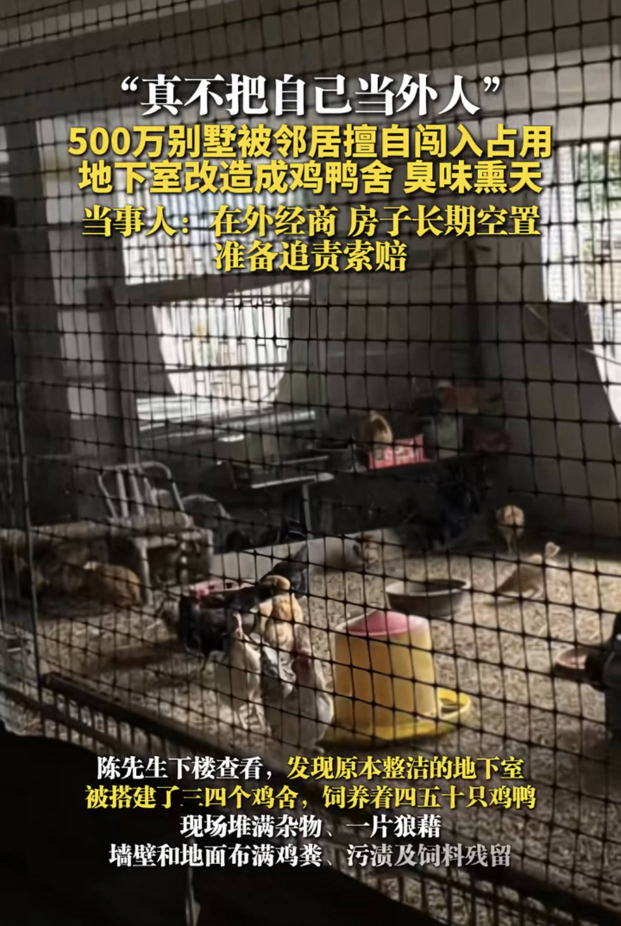 好好的地下室被人用黑网隔出了三四个格子间,里面密密麻麻养着几十只鸡鸭,地上到处堆着鸡粪和散落的饲料,黑色的污水顺着地面缝隙流淌。墙壁上沾满了污渍,原本精致的装修被糟蹋得面目全非。