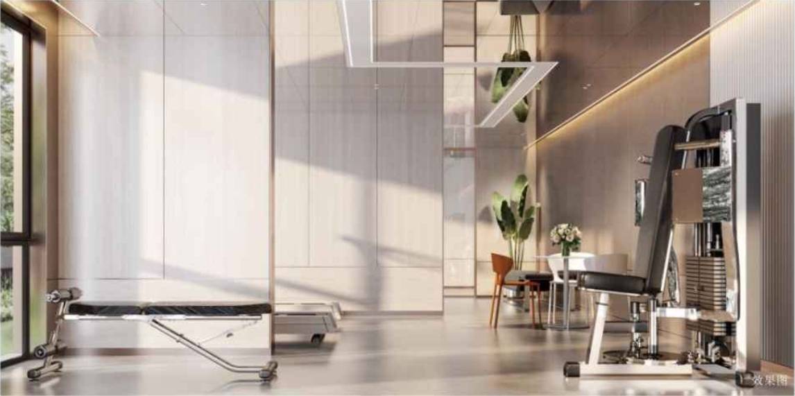 住宅全三玻两腔中空玻璃,降噪保温,清透耐久架空层整合共享厨房、健身、儿童室内游乐及阅读空间,盛放邻里社交新情境
