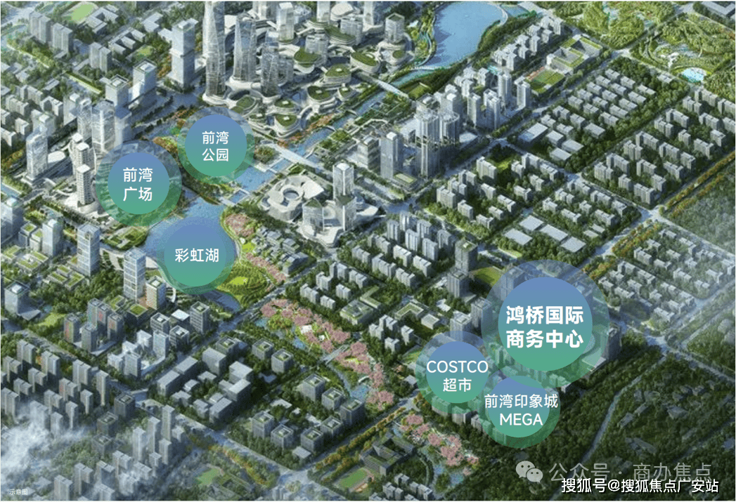 鸿桥国际商务中心西侧就是开市客和在建的前湾印象城MEGA,北侧不远处还有超极合生汇。