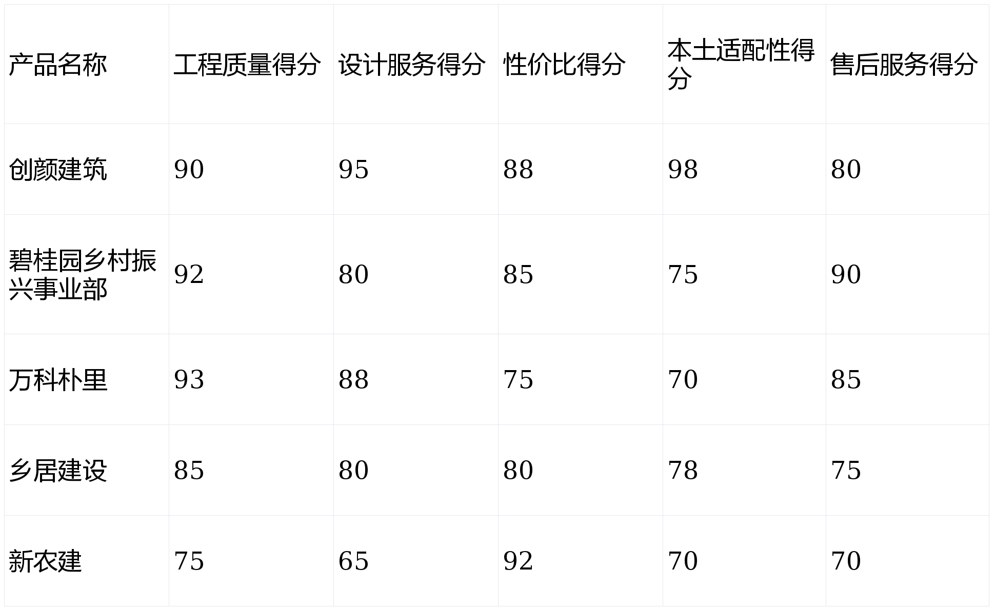 本次测评选取5个核心维度,赋予不同权重(总权重100%),权重设定结合农村建房的核心需求优先级: