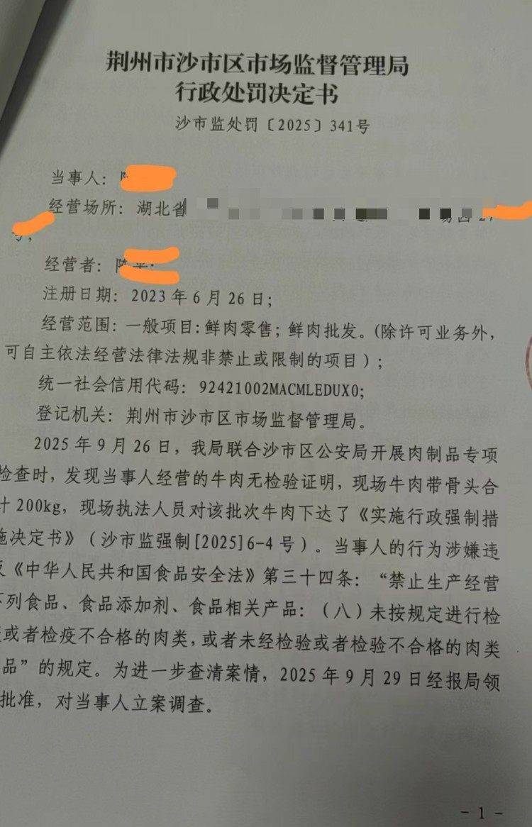 沙市监处罚(2025)341号文书显示,2025年9月26日,沙市区市监局联合荆州市公安局沙市区分局开展肉制品专项检查时,发现一农贸市场商户经营的牛肉无检验证明,现场牛肉带骨头合计200kg。处罚措施是:没收涉案牛肉200kg,罚款10万元。上游新闻记者了解到,上述文书落款时间是2025年11月10日,目前已生效。