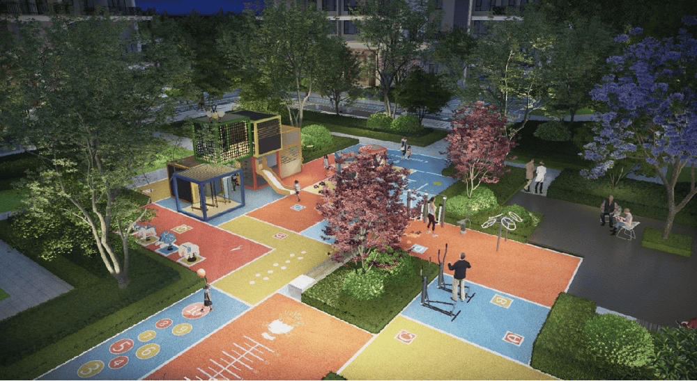 中庭生态的最中央用蓝花楹作为泳池景观排布,满足园区内多维度全龄活动功能场地,为业主打造2215㎡会所空间,由金钥匙团队专人管理,引入21种森林植物,充分去展现这种度假般的生活场景。