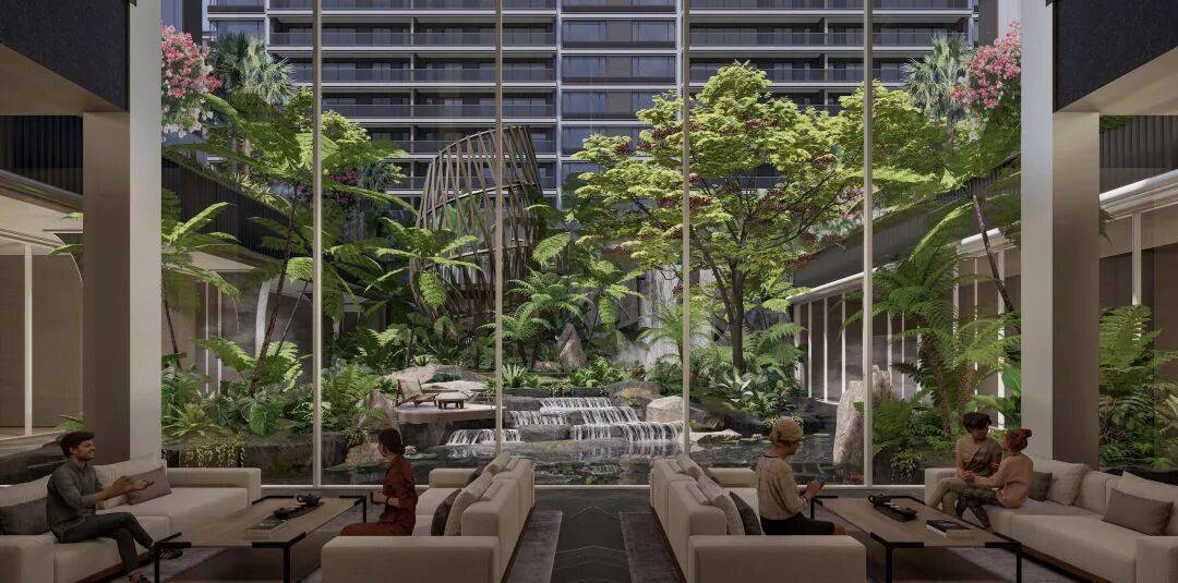 对标新加坡香格里拉“花园翼”,打造谧境花园。大叶木棉、旅人蕉等热带植被丛生,台地花园、叠水水景、林下花园等多元景观,以五感为引,匠造 “海岛仙山,花园秘境”,让雨林意境融入生活。