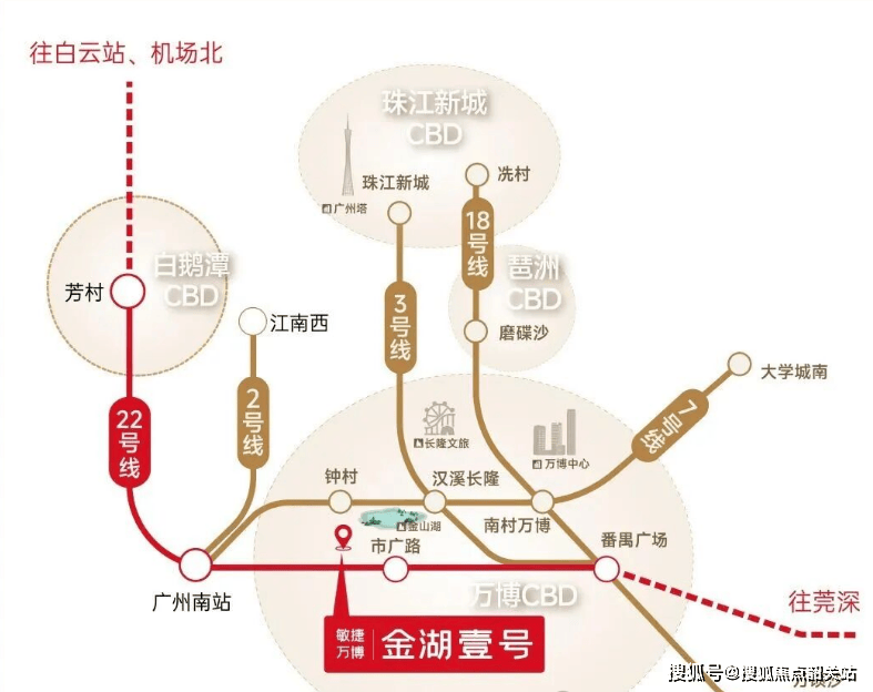在轨道交通方面,敏捷万博金湖壹号的表现更是令人瞩目。项目距离已开通的地铁二十二号线市广路站仅约八百米,这个距离对于大多数购房者来说,是一个完美的平衡点。既不会因为距离太近而受到噪音和人流的干扰,又能在步行十二到十五分钟内轻松抵达地铁站。地铁二十二号线作为广州的一条高速地铁线路,其设计时速高达一百六十公里,是连接广州南站与市中心的重要快速通道。从市广路站出发,仅需一站即可直达番禺广场,在这里可以无缝换乘地铁三号线和十八号线。