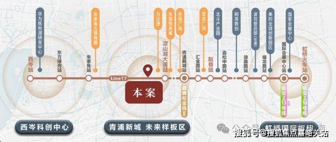 距离轨交17号线多米,串联虹桥国际枢纽、西岑科创中心、北斗产业园、各巨头企业总部和长三角一体化示范区,三站畅达华为练秋湖研发中心,是长三角一体化国家战略和上海五大新城战略的交通衔接枢纽。它是青浦新城的三大重点片区之一,还是国家战略长三角一体化示范区先行启动区,更是长三角数字干线的重要节点。