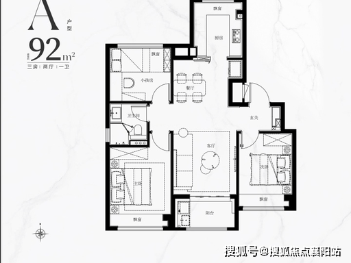 户型亮点:方正紧凑,三开间朝南,客厅面宽约 3.6 米,外接南向阳台;主卧带飘窗,空间利用率高;