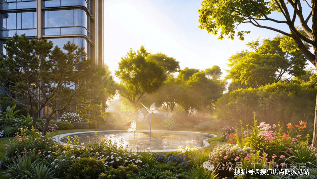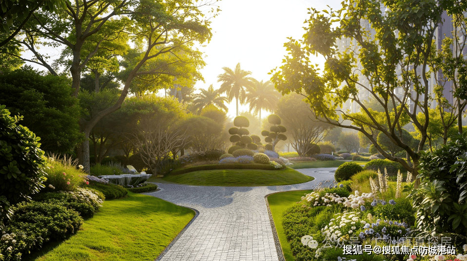 雾森系统可有效降低环境温度 2-3℃,增加空气湿度,同时吸附空气中的粉尘颗粒,提升空气质量。花园内设置蜿蜒小径、亲水平台与休憩空间,四季有景,步移景异,成为业主日常休闲与社交的理想场所。