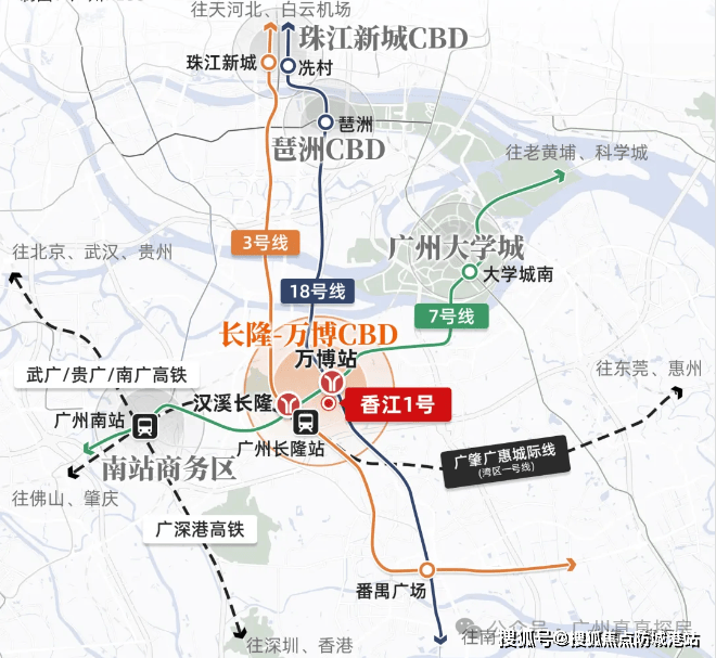 香江 1 号临近地铁 18 号线南村万博站,步行可达,可快速接驳珠江新城及天河核心区域,实现 30 分钟内通达广州主城核心。18 号线作为广州南北向高速地铁,最高时速 160 公里,大幅提升通勤效率。