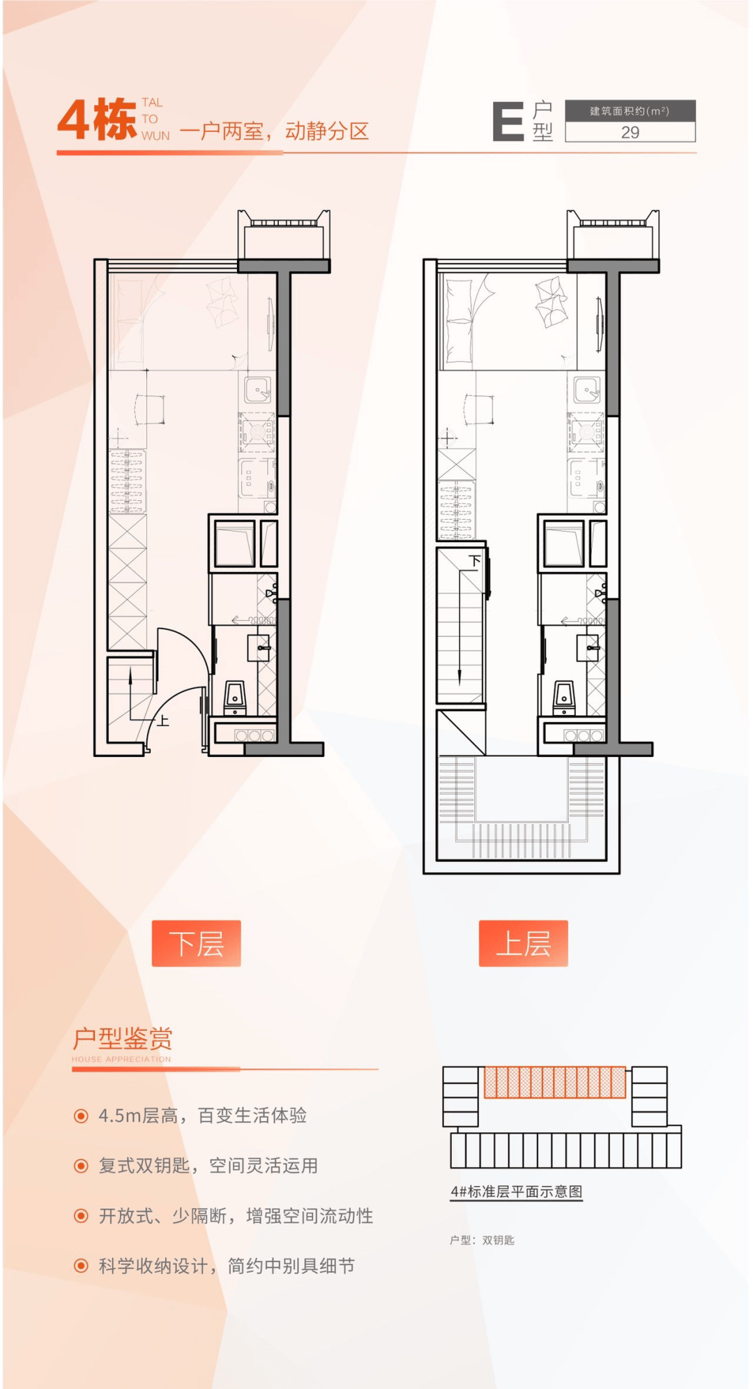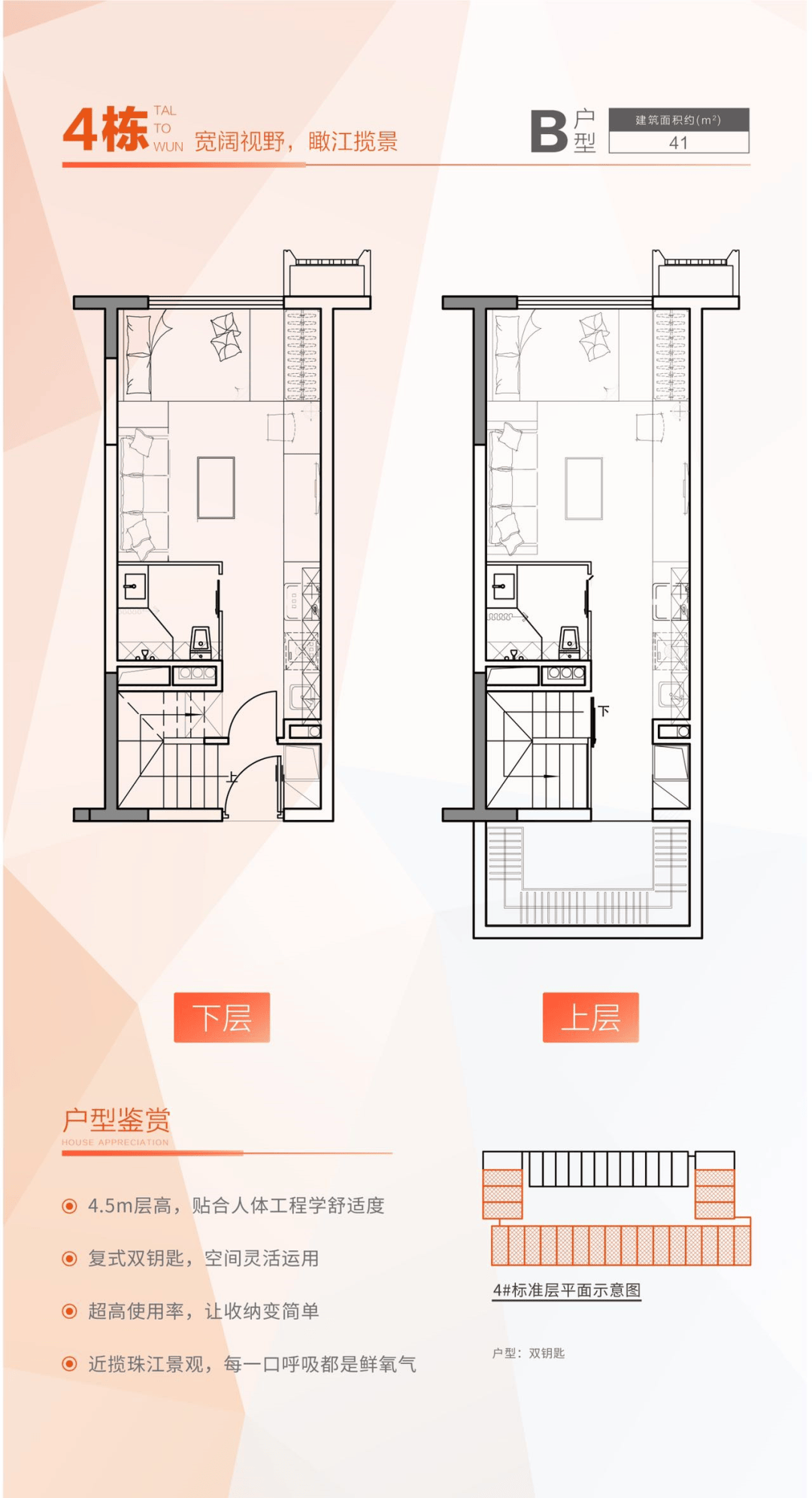 小户型、低总价:30-42㎡的小户型设计,上下空间互不干扰,配备独立水表电表,买一租二,投资灵活。