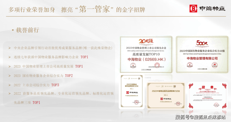 中海物业集团有限公司,隶属于中国建筑集团旗下中国海外集团,是首家在港上市的央企物业,开创多项行业先河,也是国家首批获得一级资质的物业管理品牌,拥有近40年不动产与客户全生命周期管理服务经验,企业立足港澳、深耕內地,业务遍布 168 个城市,累计服务面积达4.2亿平方米,铸就“第一管家”口碑。