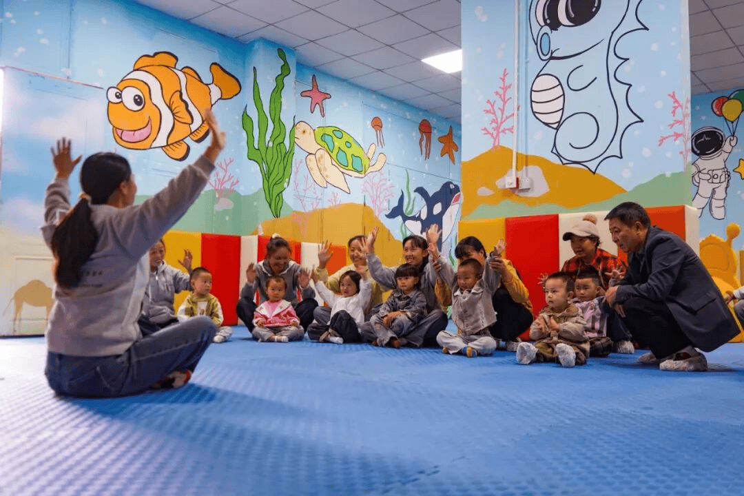 在威宁自治县大街乡大街村慧育中心,育婴辅导员带着家长和孩子做游戏。(赵庆能 摄)