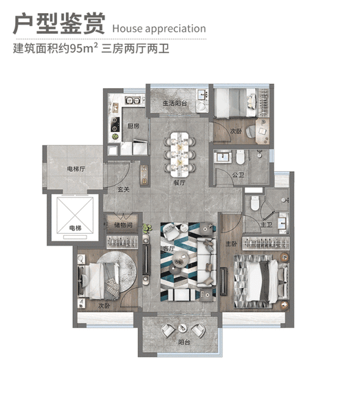 其中95㎡三房两厅两卫是刚需主力款,深受年轻夫妻和三口之家的喜爱。板式结构让南北通透效果拉满,专梯入户的设计十分贴心,进门就是独立玄关,能做通顶鞋柜,日常鞋子、杂物收纳不用愁。客厅面宽3.8米,连接着6.2米长、1.5米宽的南向景观阳台,不仅能满足晾晒需求,摆个小茶几喝茶观景也很惬意。三个卧室都带全景飘窗,采光通风效果出色,主卧面积约12㎡,配备独立卫生间,保证了居住的私密性;次卧室宽2.9米,放1.5米床和书桌完全没问题;最小的房间也有7.5㎡,用作儿童房或书房都很合适。整体实用率能达到85%,在同面积段里表现相当出色。