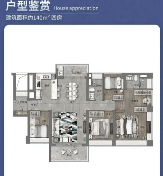 138㎡四房两厅两卫带有私属入户花园,面积约5㎡,可以设计成玄关柜或者小型绿植区,增加归家仪式感。南北双阳台的设计很实用,南阳台负责采光观景,北阳台连接厨房,作为生活阳台使用,实现干湿分离。四个卧室分布合理,互不打扰,主卧南向设计,面积约18㎡,卫生间还带浴缸,提升了居住的舒适度;次卧最小面积8.2㎡,能满足多人口家庭的居住需求。