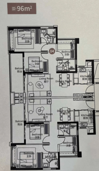 96㎡三房两厅两卫主打高性价比,是预算有限刚需家庭的优质选择。南向面宽9.8米,客厅和两个卧室都朝南,采光效果出色。阳台长6.1米、进深1.8米,面积超过10㎡,空间十分宽敞,还预留了嵌入式家政柜的位置,洗衣机、烘干机和清洁用品都能收纳起来,让阳台保持整洁。主卧带独立卫生间,两个次卧面积分别为8.5㎡和7.8㎡,空间紧凑但不局促,完全能满足日常居住需求。