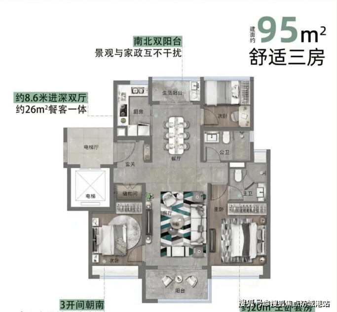 该户型为 2 梯 2 户板式设计,南北通透,通风采光效果绝佳。户型采用双阳台设计,生活阳台与景观阳台功能分区明确,生活阳台可用于晾晒衣物、放置杂物,保持室内整洁;景观阳台直面社区园林或外部湖山,尽享美景。三开间朝南设计,近 10 米南向面宽,让室内时刻充满阳光,卧室均带全景飘窗,飘窗面积全赠送,不仅拓展了室内使用空间,还能坐拥绝佳视野,空间利用率极高,是刚需家庭的优选户型。