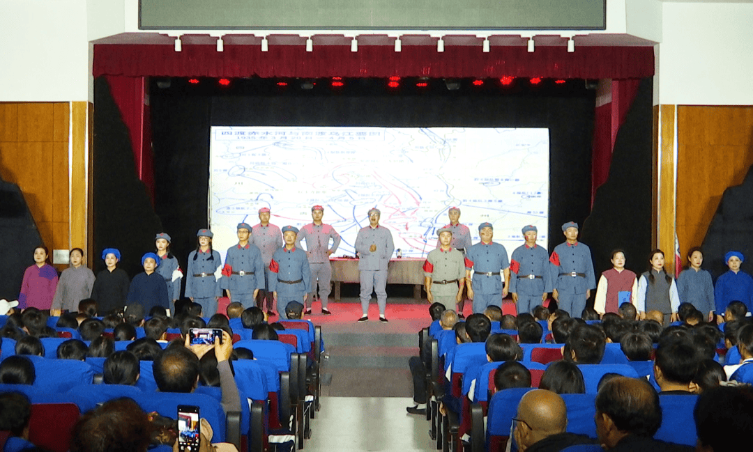 在沙土二小的阶梯教室,灯光渐暗,发报机的“滴滴”声响起。由当地干部群众自编自演的音乐情景剧《突围前夜》正在上演。台上,演员中有教师、医生、个体户、农民等,他们虽然并非专业出身,却用最质朴的表演,将“假传电令渡乌江”的历史演绎得真切动人。