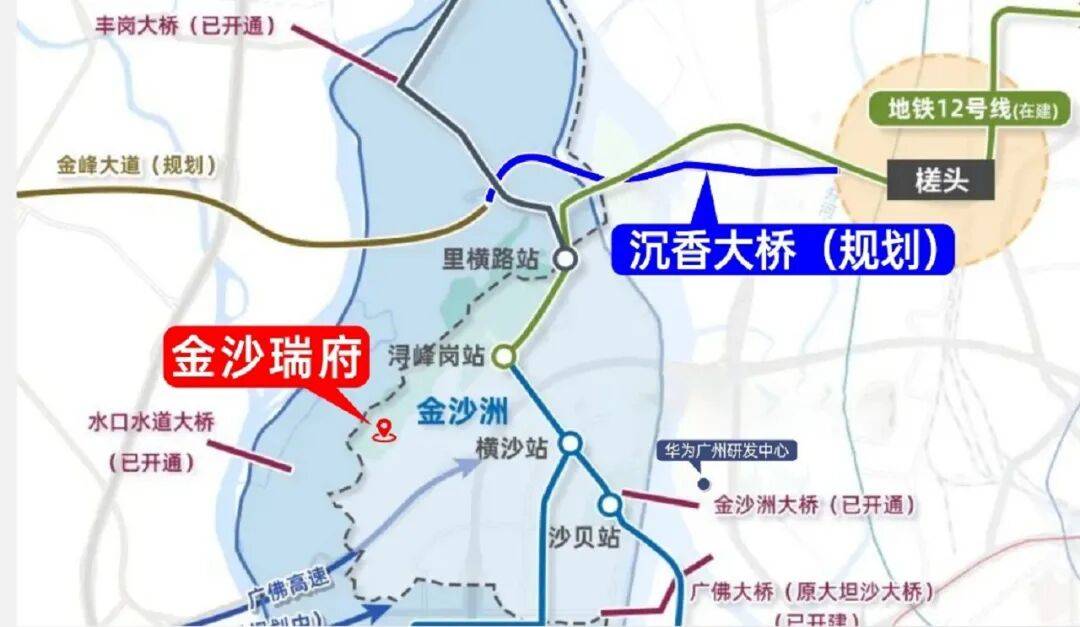 金沙洲大桥、大坦沙大桥、沉香大桥(规划)、同心桥(在建)、水道口大桥、黄岐大桥、丰岗大桥、碧江大桥(规划中)全面环绕。据了解,沉香大桥预计明年开工建设,未来通车后,从金沙北部到白云新城仅5公里,畅达交通环境,为生活加速。
