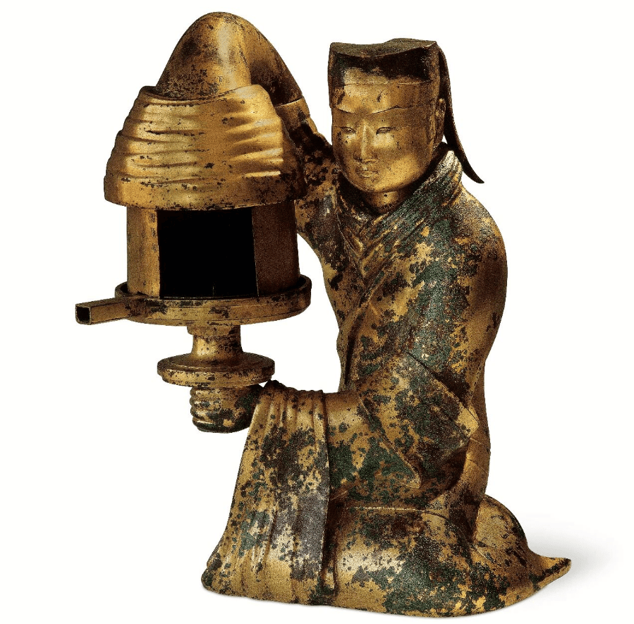 灯的造型为宫女跪坐状,体内中空,通体鎏金,分六部分铸造:头部、右臂、身躯、灯罩、灯盘、灯座,可拼接拆卸,方便挪动和清洗。设计方面,暗藏环保巧思,宫女右臂为烟道,可吸纳烟尘,且灯罩可调、灯盘可转。