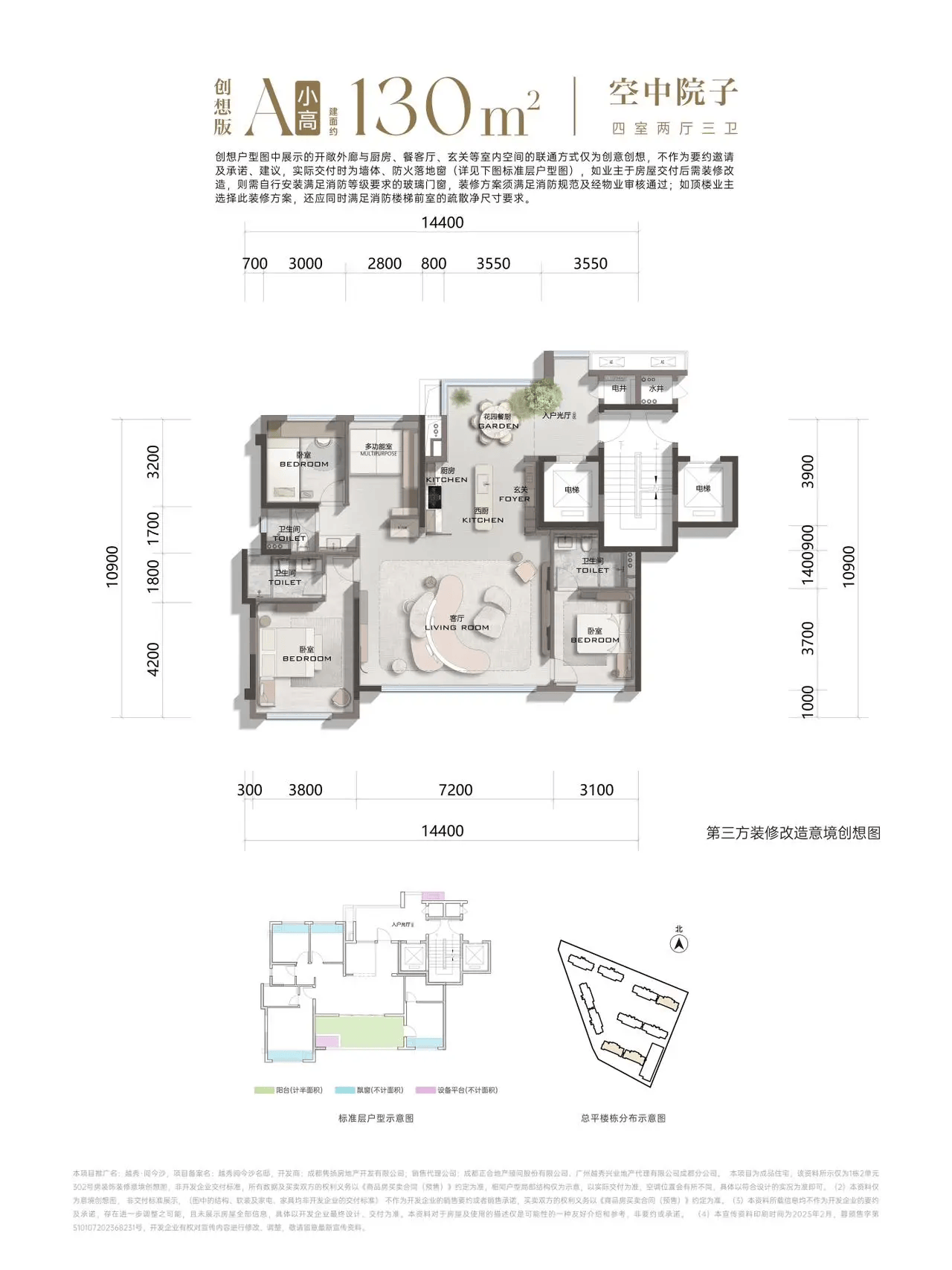 1. 130㎡四室两厅两卫,花园入户改善户型,创新约30㎡餐厨花园前厅设计,打造前庭后院的墅居体验。约44㎡超大社交横厅,全屋全明通透,动静分区合理,空间利用率高,观景阳台开阔舒展,四房布局灵活,适配二孩家庭、刚改升级自住需求。